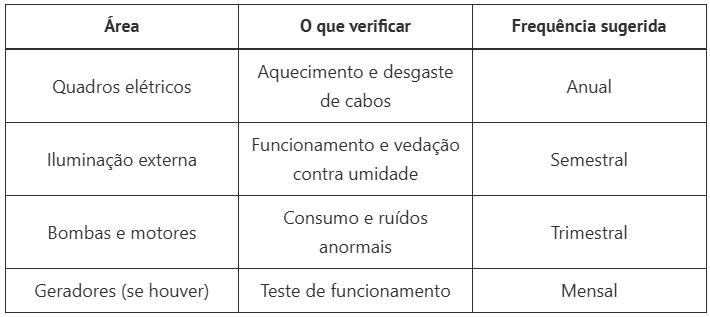 A revisão deve contemplar quadros de energia, disjuntores e iluminação das áreas comuns. Fiações antigas ou mal dimensionadas podem representar sérios riscos. Veja um resumo prático: